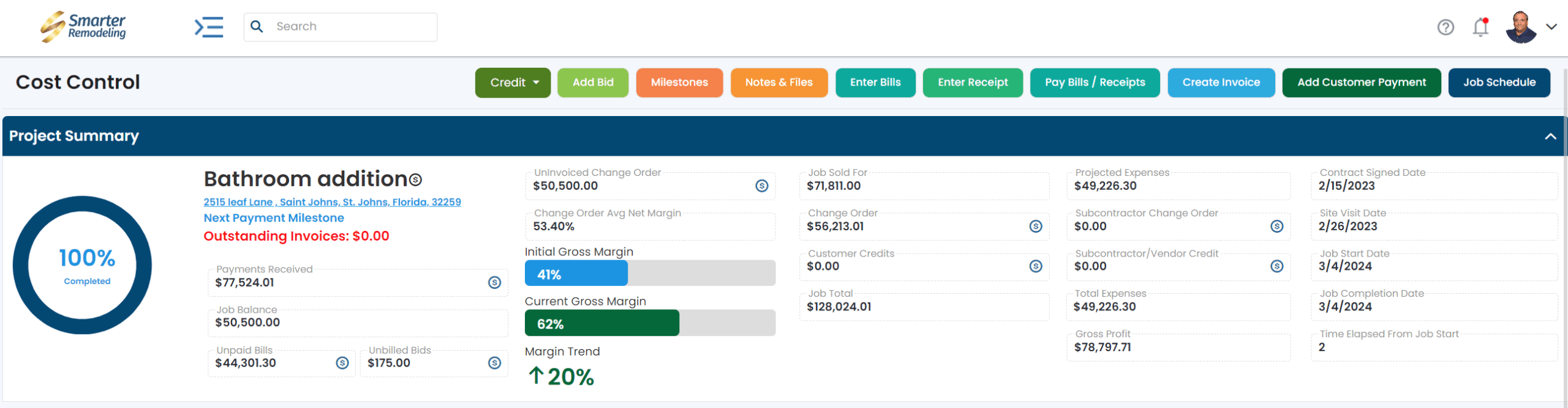 With our Cost Control screen for each project, you gain access to a wealth of summarized information like never before. Track your profit margin trend, monitor change order margins, and delve into various key metrics to understand your project’s financial standing at any given moment like unbilled bids, outstanding invoices, or Uninvoiced change orders.  This level of detailed insight empowers you to make informed decisions, identify trends, and optimize your project’s performance like never before.
