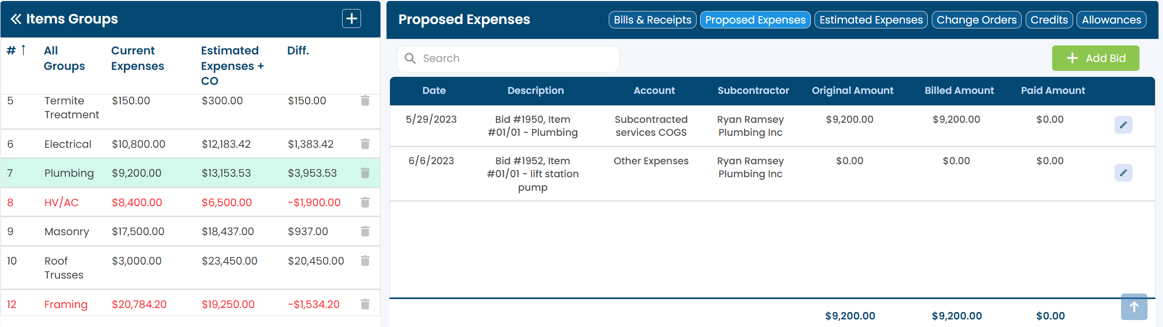 Our Item Groups or Trades panel offers detailed insights into your finances, going beyond just project-level data. You can easily compare estimated expenses with current expenses, enabling you to quickly visualize the performance of various groups or trades. This level of detail empowers you to identify which areas are performing as expected and which may require attention or optimization. With this enhanced financial visibility, you can make proactive decisions to ensure the success of your projects.